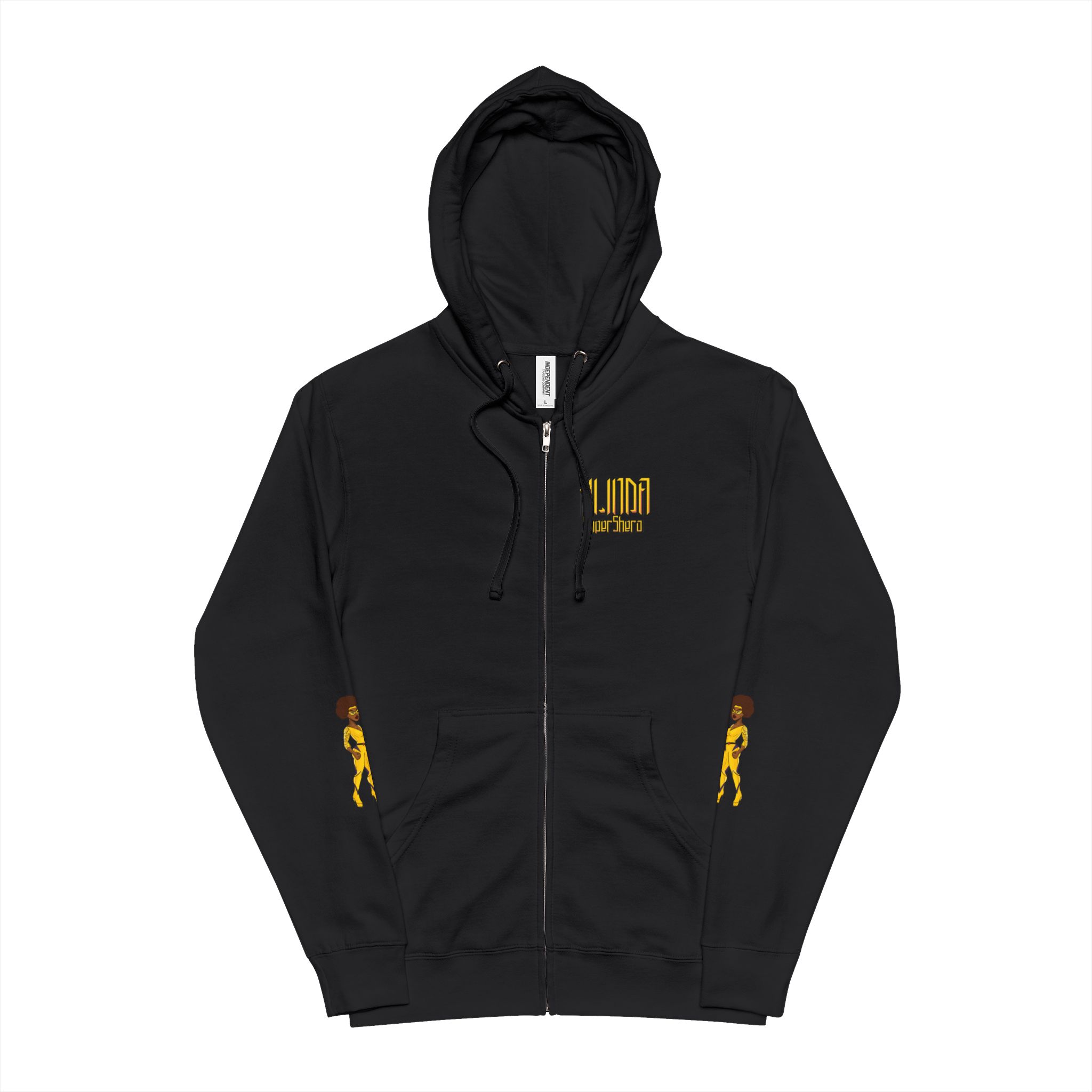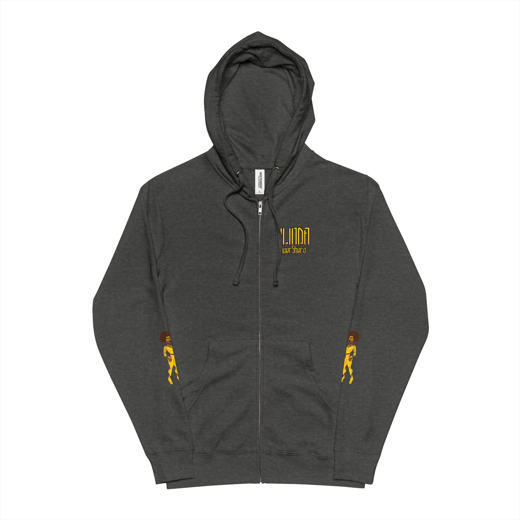 Get empowered with KILINDA SuperShero fleece zip-up hoodie! It’s the perfect blend of comfort and durability. With the KILINDA holding her sword on both sleeves, she will remind you of your inner warrior. Made from a soft 80% cotton and 20% polyester blend fleece, it offers warmth without being too heavy, with a fabric weight of 8.5 oz./yd² (280 g/m²).